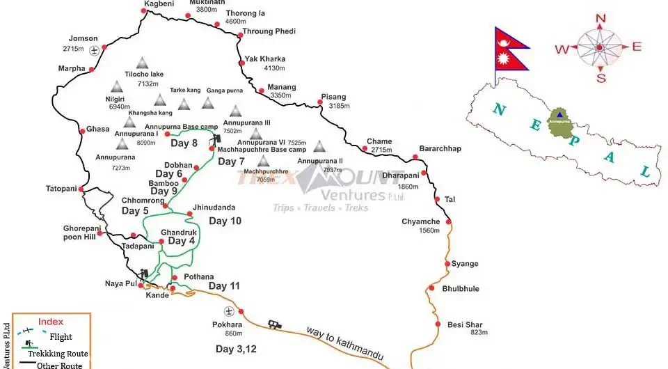 The Annapurna Base Camp map with altitude reveals significant elevation variations throughout the journey. Therefore, proper acclimatization becomes essential, especially after crossing 3,000 meters.